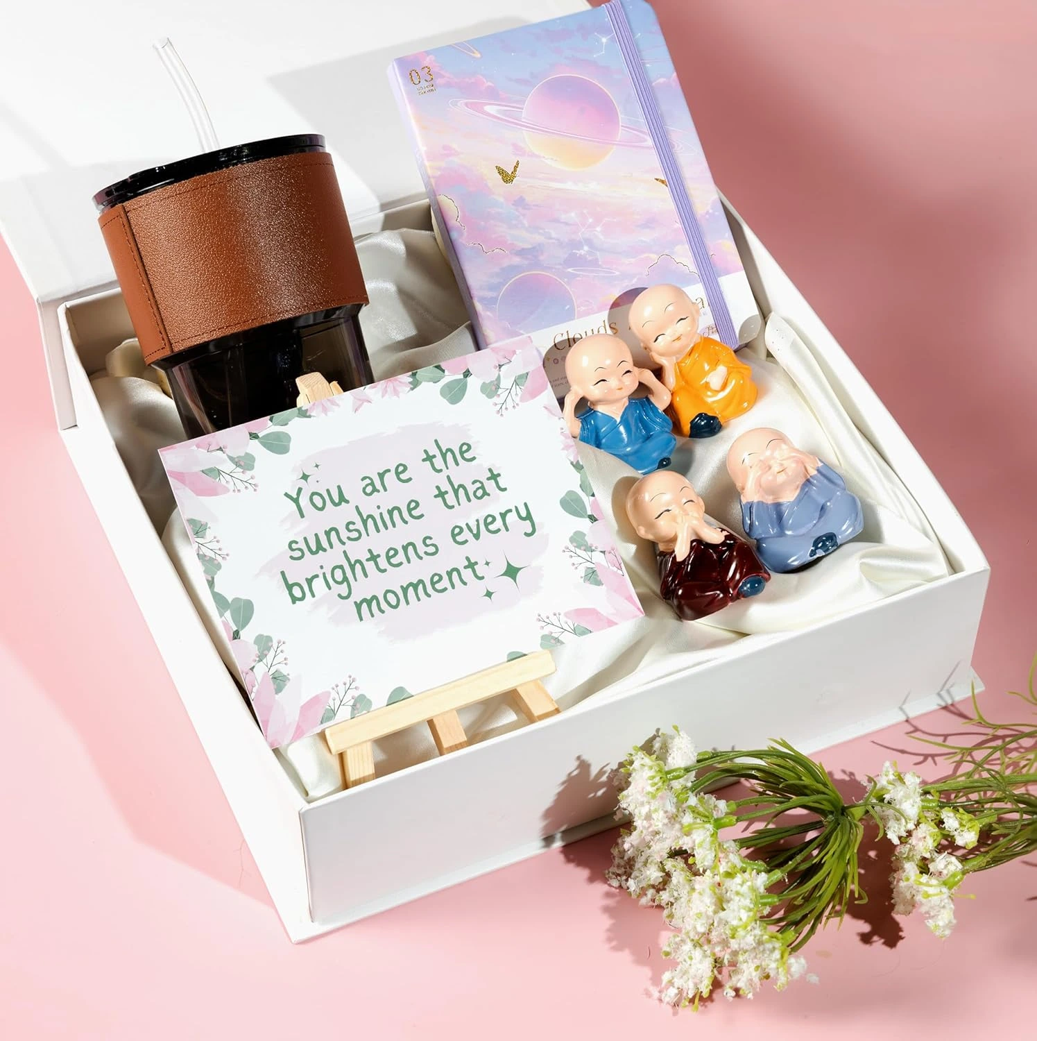This unique gift set includes a stylish glass sipper bottle, adorable mini Buddha figurines, a heartfelt greeting card with easel stand, and a practical mini pocket diary—making it a complete keepsake gift for friends, family, colleagues, or employees.