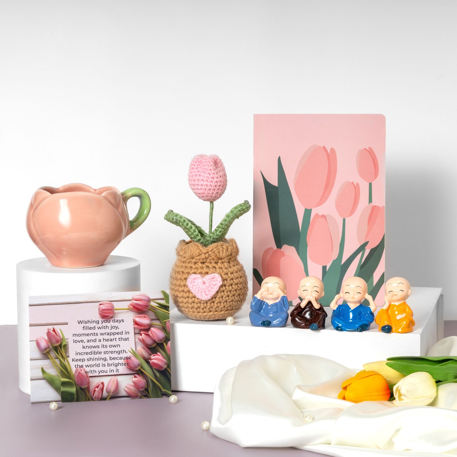 Rarejoy Tulip Gift Combo – Crochet Tulip Pot, Diary, Ceramic Mug, Buddha Monks & Greeting Card