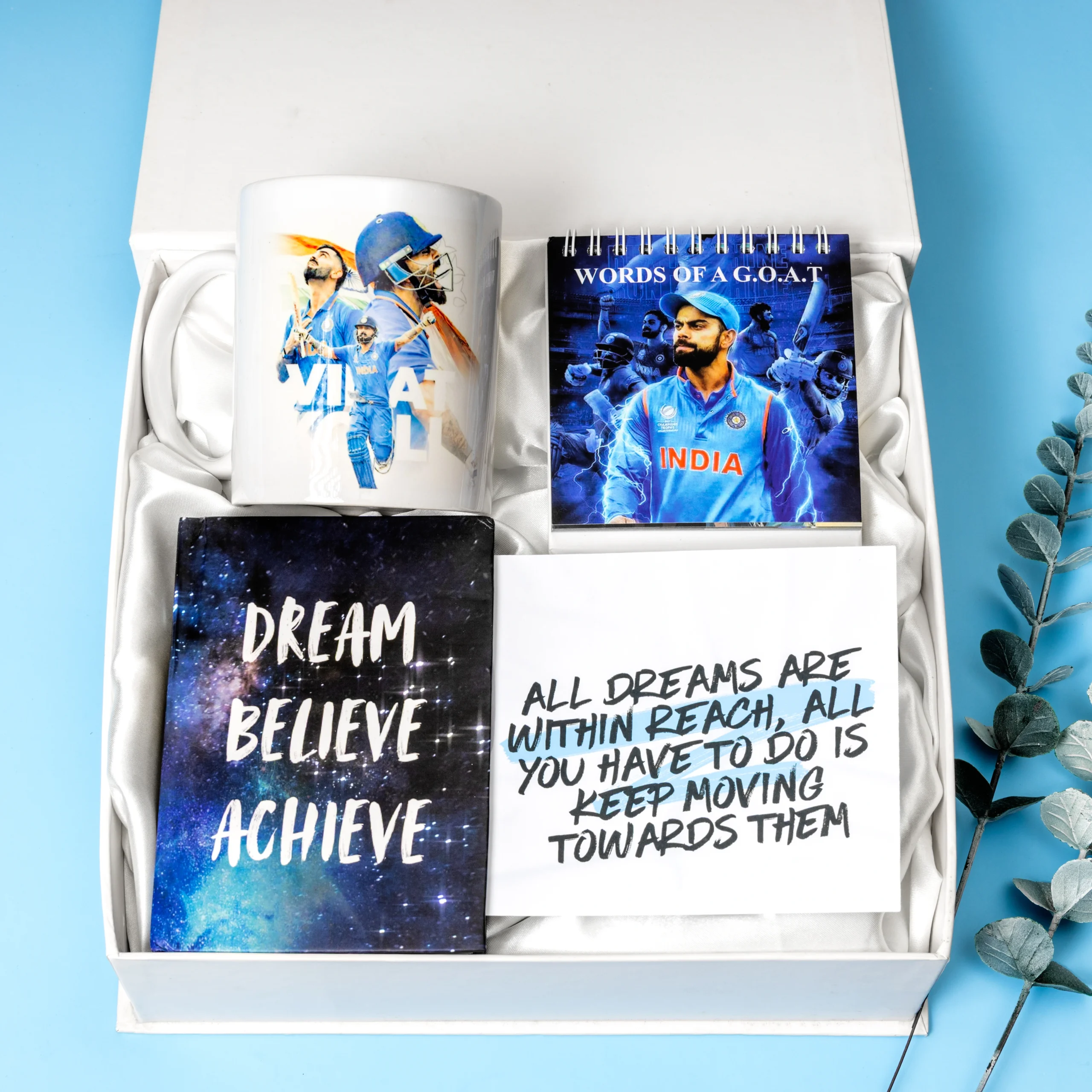 Virat Kohli Inspired Gift Hamper by Rarejoy is the perfect gift for cricket lovers and fans of Virat Kohli. This premium hamper includes a motivational mug, quote-based desk calendar, diary, and greeting card—designed to inspire focus, discipline, and a winning mindset. Ideal for birthdays, return gifts, and special occasions, it’s a unique and meaningful gift for every cricket enthusiast.